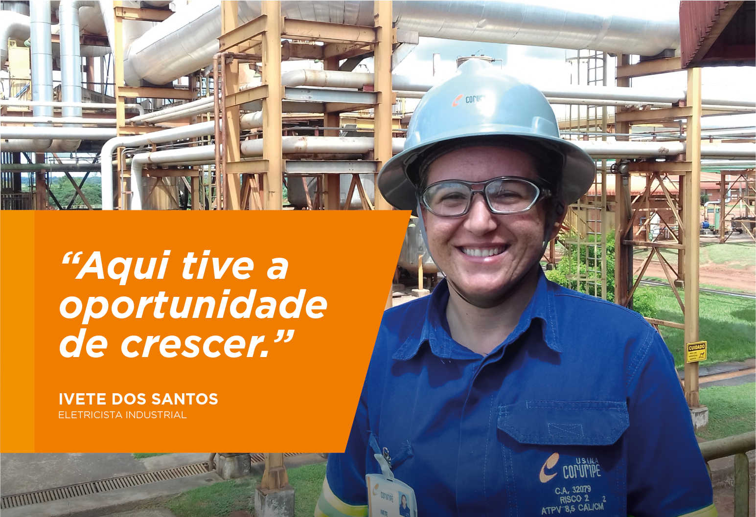 Quem abre a campanha é Ivete dos Santos. Na companhia desde 2004, a colaboradora atuou na montagem da unidade de Limeira do Oeste e passou por cargos diversos até assumir a função de eletricista industrial, depois de participar de um processo de recrutamento interno. Formada em eletrotécnica, Ivete valoriza as chances recebidas na carreira. "Gosto do meu trabalho e, na Usina Coruripe, tive a oportunidade de crescer no decorrer dos anos. A empresa acreditou no meu potencial e me sinto realizada", disse.