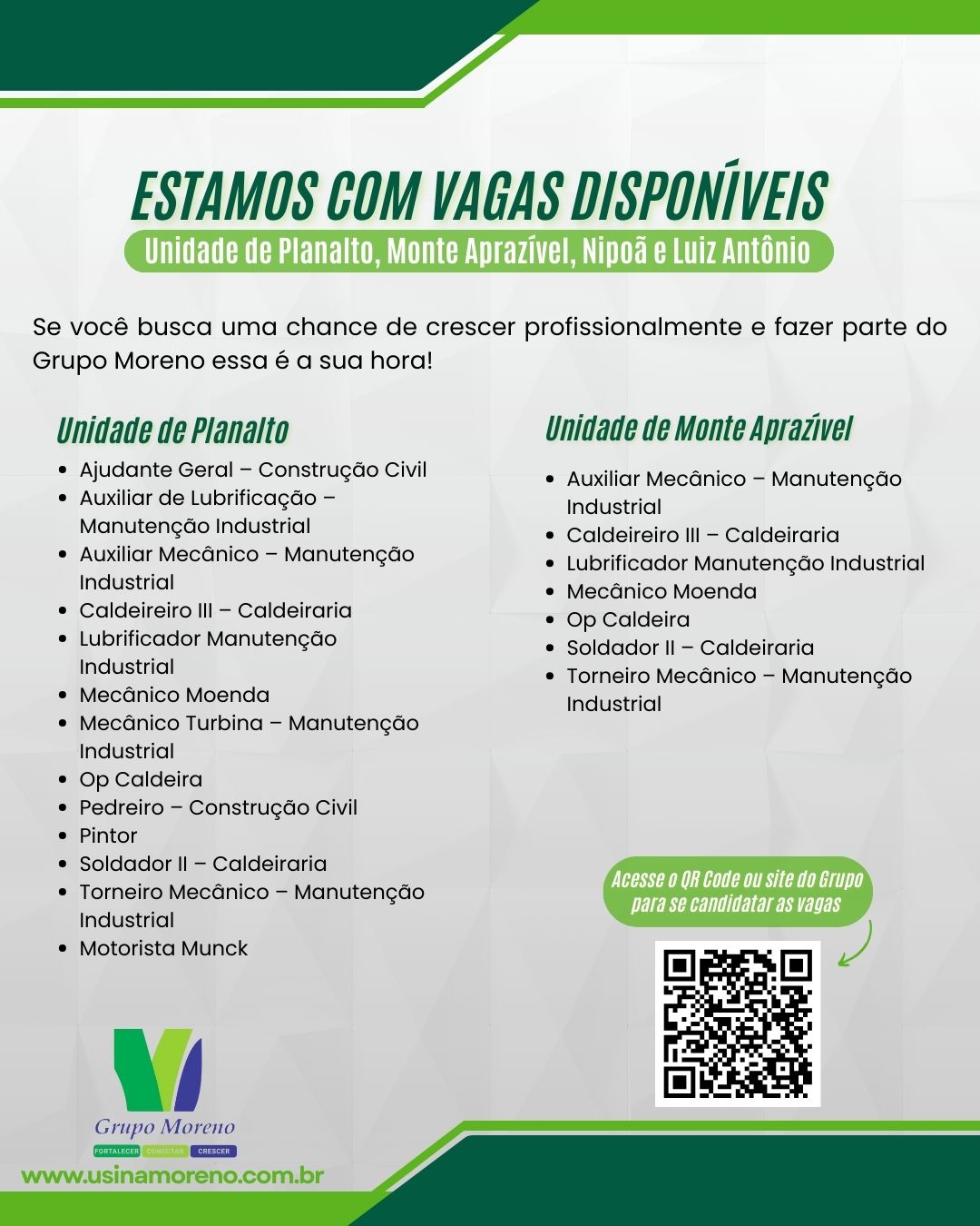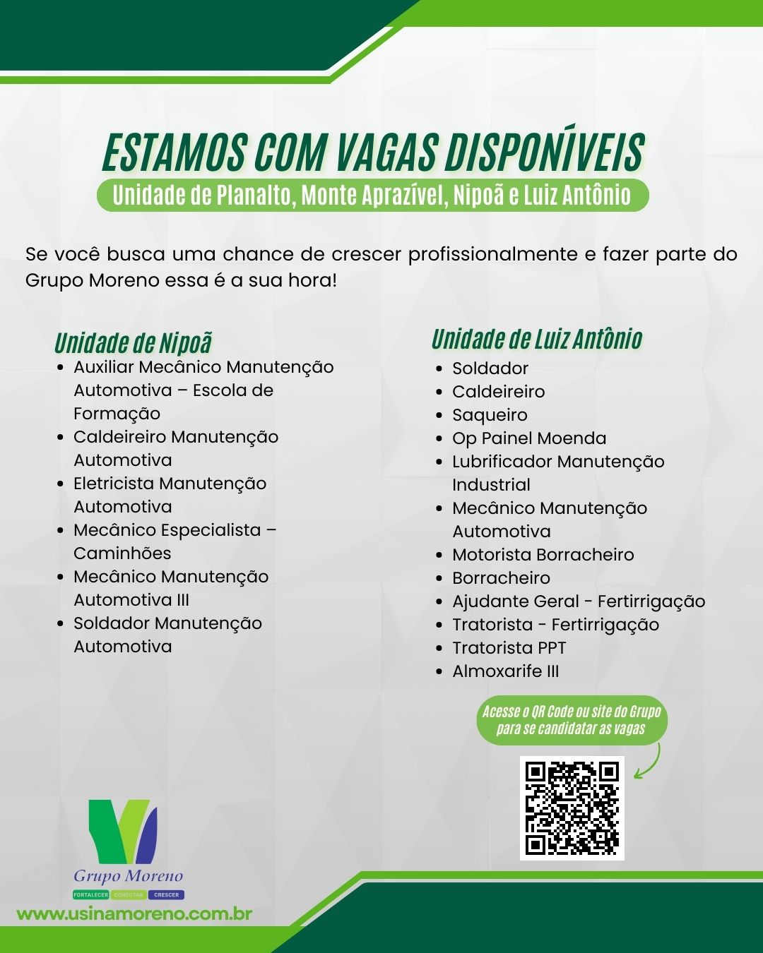Para consultar todas as oportunidades e se candidatar, acesse: www.usinamoreno.com.br/trabalhe-conosco