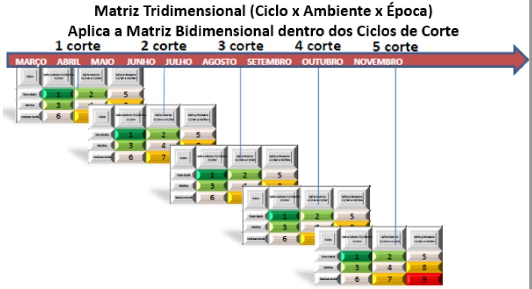 “Com a adição do terceiro fator, a outrora Matriz Bidimensional passou a ser Tridimensional, que nada mais é do que um sistema de colheita que busca mitigar e reduzir a exposição dos canaviais a déficit hídrico, em especial daqueles com maior potencial de produção - cana planta e socas de segundo e terceiro corte.” Estimativas apontam que, a cada 100 mm de redução de déficit hídrico no ciclo da cultura, é possível aumentar a produtividade de 7 a 10 TCH.
