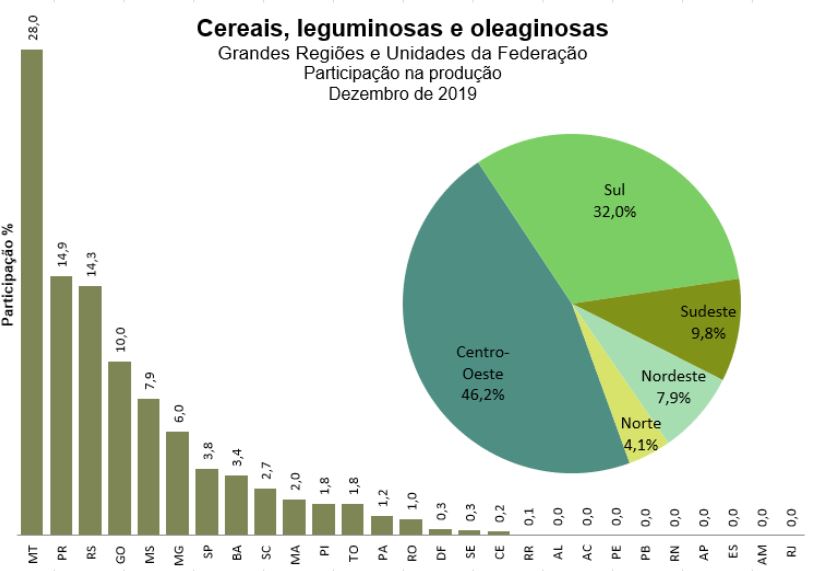 Regionalmente, o volume da produção de cereais, leguminosas e oleaginosas apresentou a seguinte distribuição: Centro-Oeste, 111,5 milhões de toneladas (46,2%); Sul, 77,2 milhões de toneladas (32,0%); Sudeste, 23,7 milhões de toneladas (9,8%); Nordeste, 19,2 milhões de toneladas (7,9%) e Norte, 9,8 milhões de toneladas (4,1%). Todas as Grandes Regiões, apresentaram aumento na produção: Centro-Oeste (10,4%), Região Norte (9,7%), Região Centro-Oeste (10,4%), Região Sul (3,6%), Região Nordeste (0,4%) Região Sudeste (3,7%). O Mato Grosso lidera como maior produtor nacional de grãos, com uma participação de 28,0%, seguido pelo Paraná (14,9%), Rio Grande do Sul (14,3%), Goiás (10,0%), Mato Grosso do Sul (7,9%) e Minas Gerais (6,0%), que, somados, representaram 81,1% do total nacional.