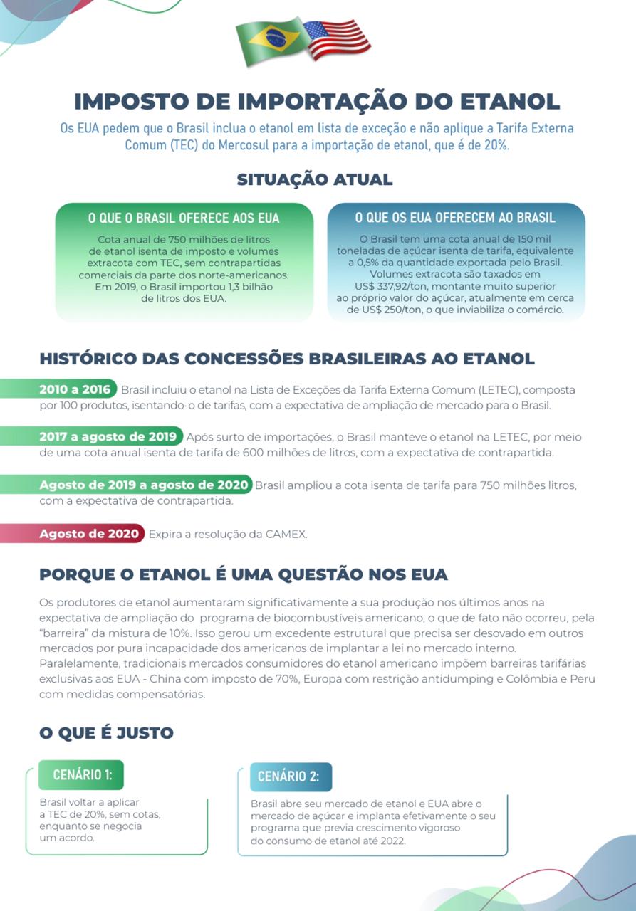 Os EUA pedem que o Brasil inclua o etanol em lista de exceção e não aplique a Tarifa Externa Comum (TEC) do Mercosul para a importação de etanol, que é de 20%