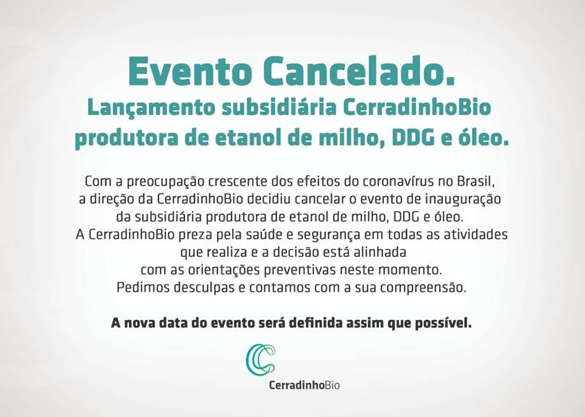 Na última sexta-feira (13) a área de comunicação da CerradinhoBio, localizada em Chapadão do Céu, no sudoeste goiano, divulgou comunicado informando que, em função do cenário de Coronavírus, o evento de inauguração da Planta de Etanol de Milho, previsto pra o dia 27/03, próximo, foi CANCELADO.