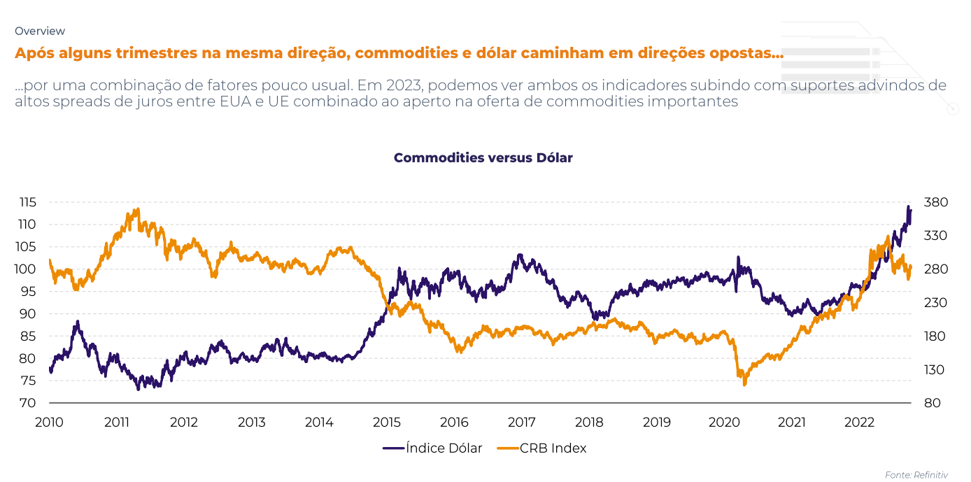 No ciclo de 2022/2023, ocorre o terceiro ciclo consecutivo de La Niña, o que deve trazer mais impactos à produção. "Esse é outro fator que aponta para uma tendência altista devido ao risco climático (prêmio climático). O fenômeno está muito forte na Argentina e um pouco menos no sul do Brasil. Esse é o risco que vemos para produção de soja e milho na América do Sul.
