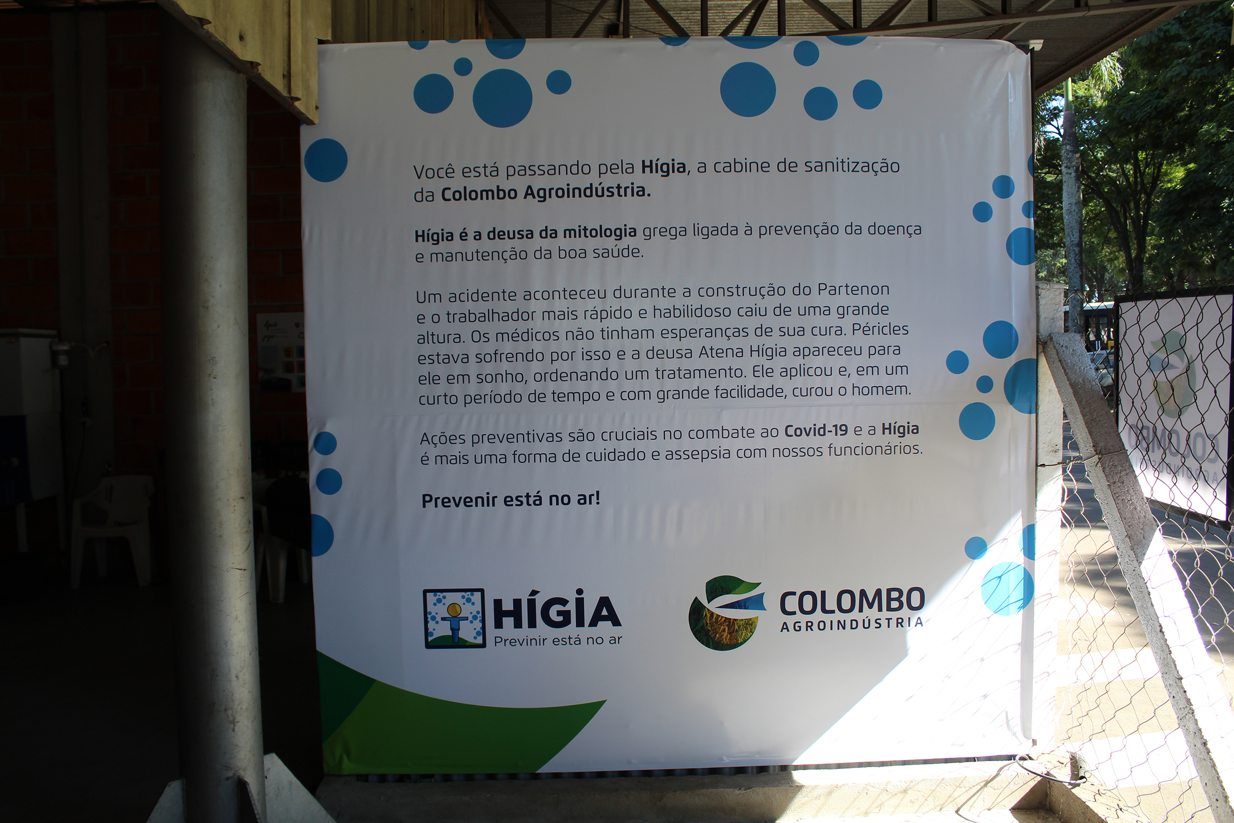 A Colombo Agroindústria acaba de implementar uma solução inovadora que se soma ao rol de medidas de enfrentamento ao Covid-19 já praticados pela empresa. Trata-se de uma cabine de sanitização batizada de Hígia - alusiva à deusa da mitologia grega ligada à prevenção da doença e manutenção da saúde. O sistema entrará em funcionamento hoje (22 de abril) na unidade de Ariranha.