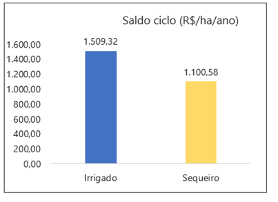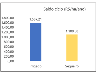 Gráfico 01. Demonstrativo de lucro obtido na simulação de irrigado vs sequeiro em reais por hectare por ano com uma longevidade de 5 anos