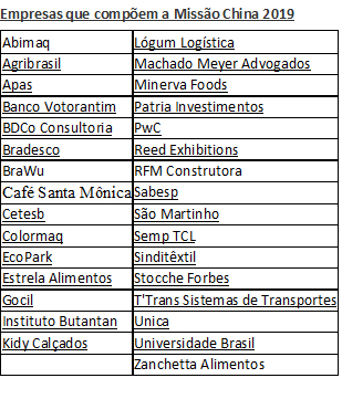 A Missão China 2019 conta com o apoio e suporte financeiros da AstraZeneca, Bank of Communications, Bank of China, CRRC, LinkLatters, Pinheiro Neto Advogados e PwC.