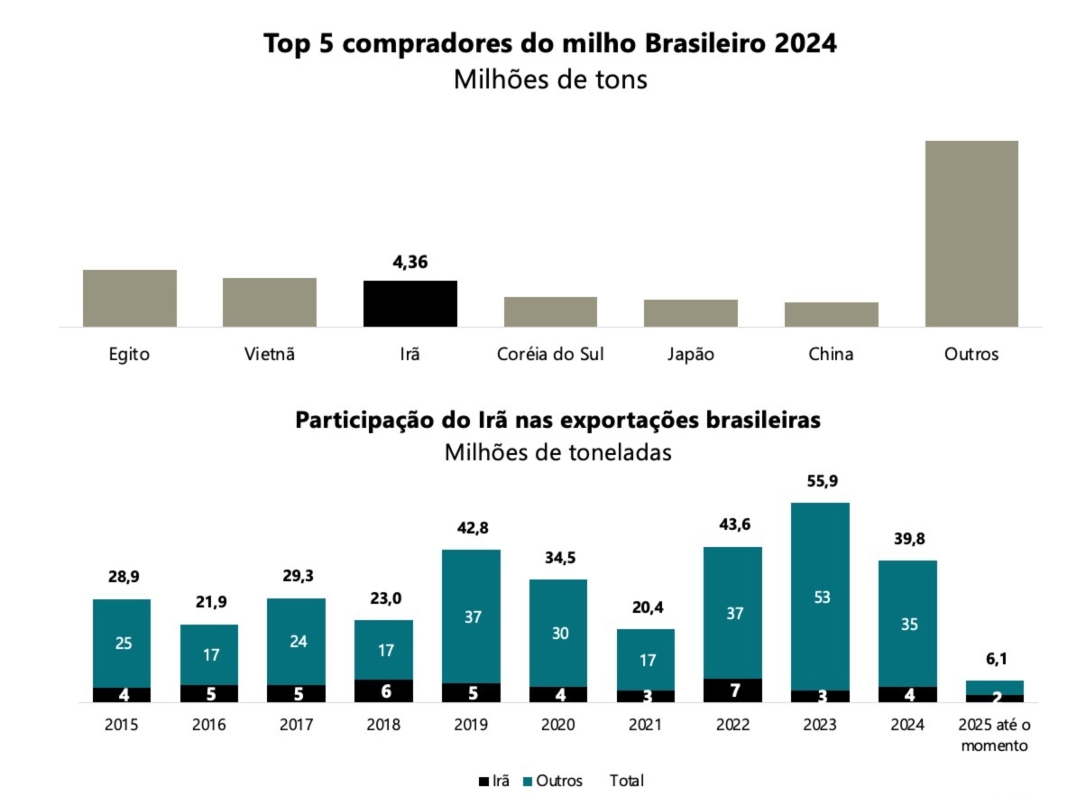 O Irã é hoje o 7º maior importador global de milho e figura entre os principais destinos do cereal brasileiro, além de importar cerca de 1 milhão de toneladas de soja do Brasil. A continuidade dos conflitos, especialmente com danos à infraestrutura portuária ou sanções internacionais, pode limitar essas exportações e provocar uma sobreoferta interna.