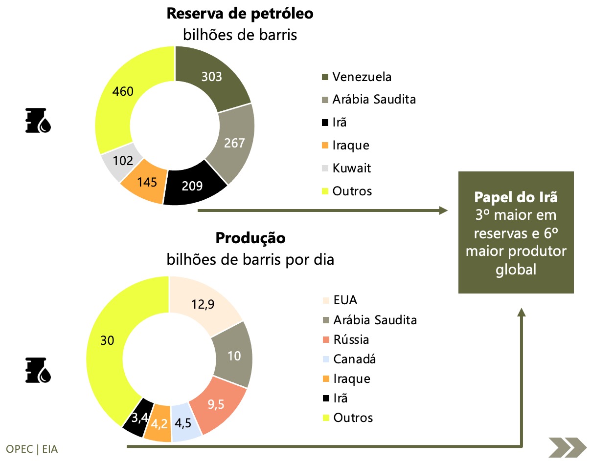 O Irã possui a 3ª maior reserva de petróleo do mundo, segundo a EIA (Administração de Informação de Energia), do governo dos EUA. Embora sua produção esteja limitada por sanções, qualquer conflito que afete suas exportações ou sua infraestrutura de produção impacta diretamente os preços globais do petróleo. O mercado reage com alta por risco de oferta, efeito imediato em frete, energia e fertilizantes nitrogenados.