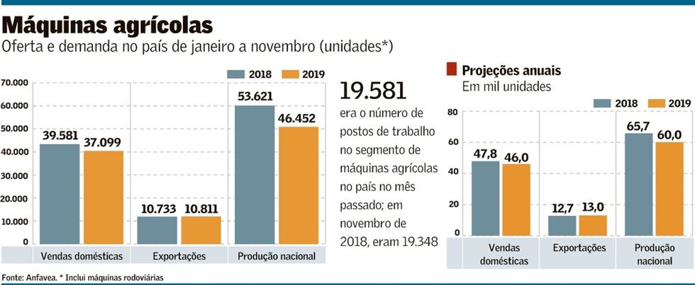 Nesse cenário, a previsão da Anfavea de que as vendas de máquinas agrícolas no país alcançarão 46 mil unidades em 2019 não deverá ser alcançada, reconheceu o presidente da entidade, Luiz Carlos Moraes. De janeiro a novembro, as vendas somaram 40,4 mil unidades, queda de 6,8% em relação ao mesmo período do ano passado. Nos 12 meses de 2018, foram 47,7 mil unidades. Assim, só se houver uma disparada, nunca antes vista até o Natal, as vendas de 46 mil máquinas projetadas pela Anfavea serão alcançadas.