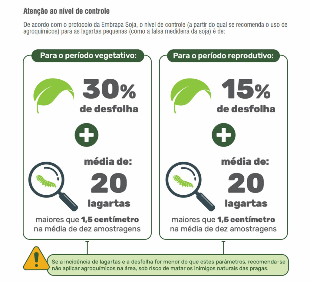 “O controle de qualquer praga, não somente da falsa medideira, é fundamental para mantê-la em um nível economicamente aceitável, ou seja, evitar perdas de produtividade que impactem na sua rentabilidade. O ponto principal é buscar orientação correta sobre como identificar o nível de ação, mortalidade natural e de estratégias de manejo, como o refúgio”, destaca a técnica do Departamento Técnico e Econômico do Sistema FAEP/SENAR-PR, Ana Paula Kowalski.