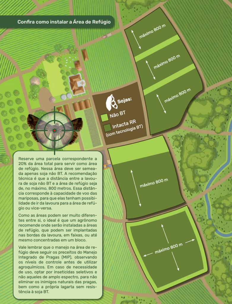 O refúgio é formado por áreas que devem ser conduzidas com sementes convencionais de soja, sem a tecnologia BT, próximo às lavouras com essa tecnologia. O objetivo é que pragas que se tornaram resistentes à toxina presente neste tipo de planta possam cruzar com insetos da área de refúgio (portanto suscetíveis a essa tecnologia), gerando uma nova linhagem de indivíduos sem resistência. Esse tipo de estratégia é fundamental para preservar a eficácia da tecnologia BT por mais tempo. “O refúgio atrasa a resistência”, atesta Gómez.