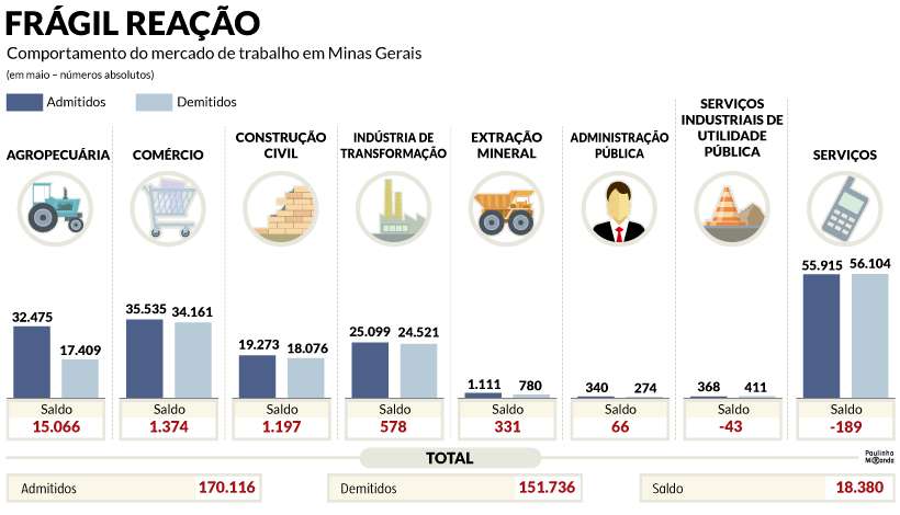 Em contraposição, municípios industrializados e que têm no setor de serviços boa parte da sua sustentação de emprego e renda, como Belo Horizonte e Betim, amargaram queda do emprego formal em maio. Na capital mineira, o saldo do emprego formal foi negativo em 1.728 vagas, e na vizinha Betim houve 139 demitidos a mais que os contratados.