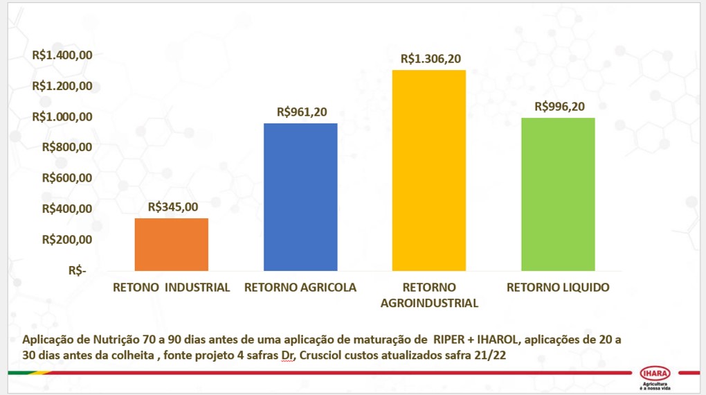 Thiago Duarte, consultor de desenvolvimento de mercado da IHARA, explica que os maturadores de ação lenta, devem ser aplicados cerca de 45 as 60 dias antes da colheita, em pleno verão, comprometendo o crescimento da cana. Já o RIPER, pode ser aplicado a partir de 15 a 45 dias antes da colheita, preservando até 30 dias de pleno crescimento da cultura que assegurará maior produção de toneladas de cana e consequentemente maior quantidade de açúcar por hectare, com grande flexibilidade com maior PUI e janela de colheita.