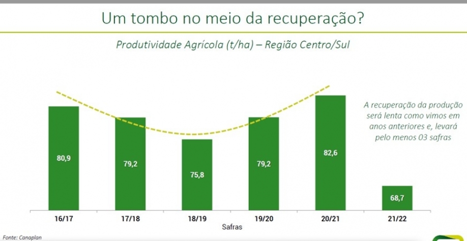 Todos esses fatores e mais a seca severa, a ocorrência de 4 a 5 geadas, dependendo da região e grande quantidade de incêndios, derrubaram a média de produtividade de cana para 68,7 toneladas por hectare, contra 82,6 da safra 20/21, segundo a Canaplan. Os analistas da consultoria observaram que a produtividade dos canaviais na região Centro-Sul vinha em uma crescente e agora levou um tombo. E a recuperação da produção canavieira será lenta, levará em torno de três anos.