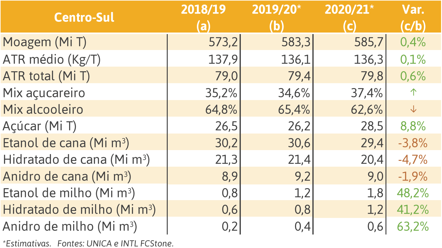 Para a INTL FCStone Inc, em termos de produção, o grande destaque é o mix. “Em 2018/19 foi bastante alcooleiro e tende a ser ainda mais na safra atual. Para 20/21 prevemos aumento do mix açucareiro, de 34,6% na safra 2019/20, para 37,4% na safra 20/21. Esperamos um crescimento mais distante dos valores históricos do Centro-Sul”, observa Costa.