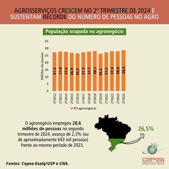 O agronegócio empregou 28,6 milhões de pessoas no segundo trimestre de 2024, avanço de 2,3% (ou de aproximadamente 643 mil pessoas) frente ao mesmo período do ano passado, conforme indicam pesquisas realizadas pelo Cepea (Centro de Estudos Avançados em Economia Aplicada), em parceria com a CNA (Confederação da Agricultura e Pecuária do Brasil). Novamente, trata-se de um recorde da série histórica, iniciada em 2012. A participação do setor no total de ocupações do Brasil seguiu em 26,5% de abril a junho de 2024.