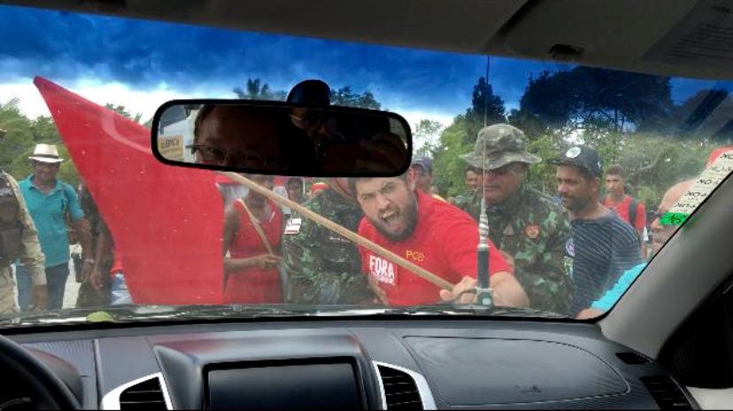 Os elementos armados com foices, facões e porretes atacaram o carro, chegando a quebrar o vidro frontal. Felizmente, o Ministro e sua equipe conseguiram se evadir do local.