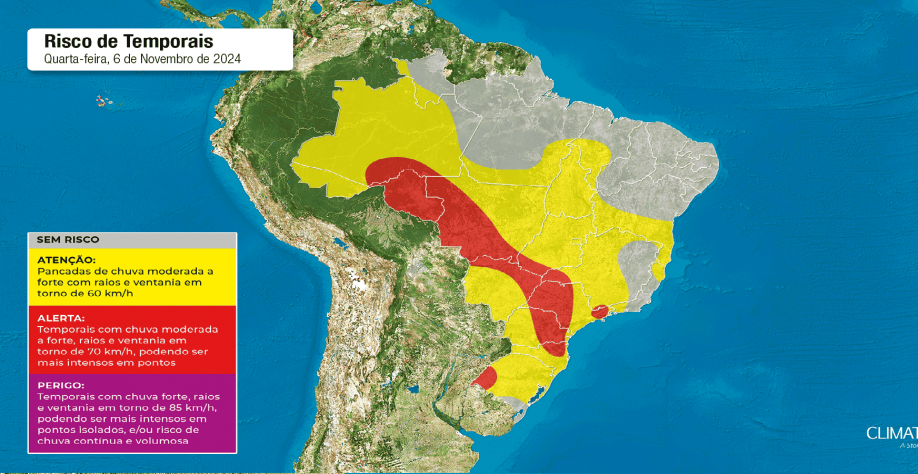 Mas a Climatempo alerta para temporais no extremo sul de Goiás, na divisa de Mato Grosso do Sul com Goiás e com Mato Grosso e em todo o centro-oeste e sul de Mato Grosso, incluindo a capital Cuiabá.