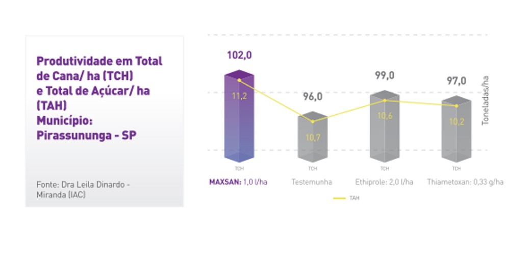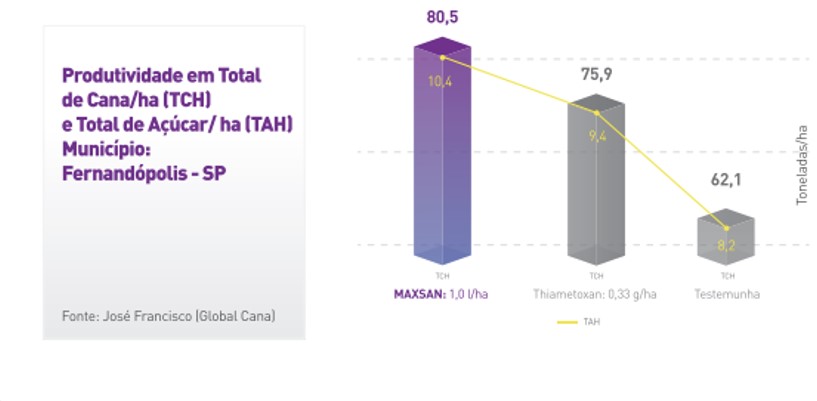 Tanto os estudos realizados, como o uso comercial do produto nos canaviais compravam que MAXSAN controla a cigarrinha em todas as fases de seu desenvolvimento. Isso é inovador e muito importante, pois novas tecnologias para o controle da praga possibilitam aos produtores e usinas rotacionarem os ingredientes ativos no campo reduzindo a possibilidade de aparecer populações resistentes aos inseticidas.