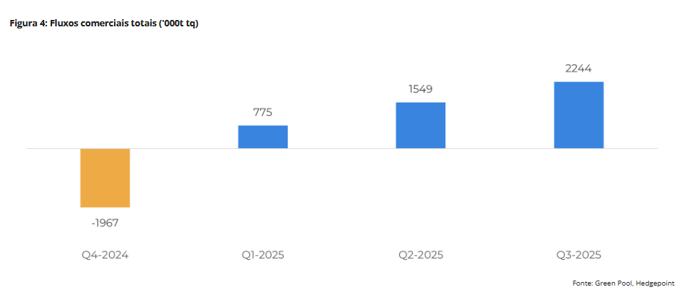 "A demanda chinesa pode ser afetada por tarifas, mas, com produção interna acima da média e paridades que se mantiveram fechadas, sua presença internacional deve ser menor. No mercado de energia, o impacto no Brasil parece improvável, com o etanol mantendo preços estáveis devido à ausência de problemas de estoque e volatilidade externa", como efeito do fim da PPI, indica a analista.