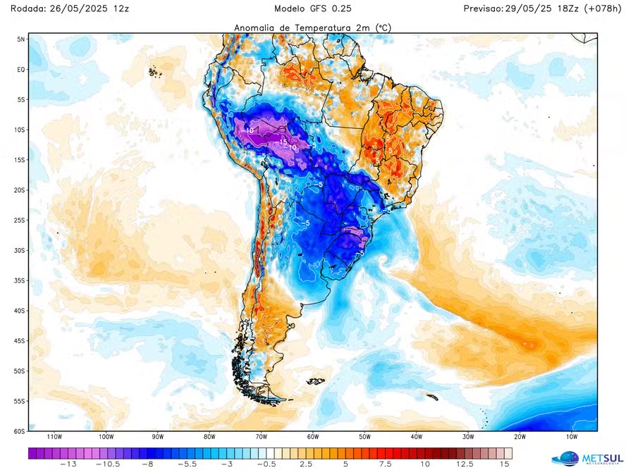 “Por ter uma trajetória continental, vai chegar potente e muito forte. Se a trajetória fosse oceânica, perderia força no caminho pelo contato com a água do mar. Ela será intensa, terá características típicas do inverno e ainda com impacto importante em parte do Centro-Sul da América do Sul, porque pega Argentina, Paraguai e Bolívia”, explica a meteorologista Estael Elias, da MetSul.