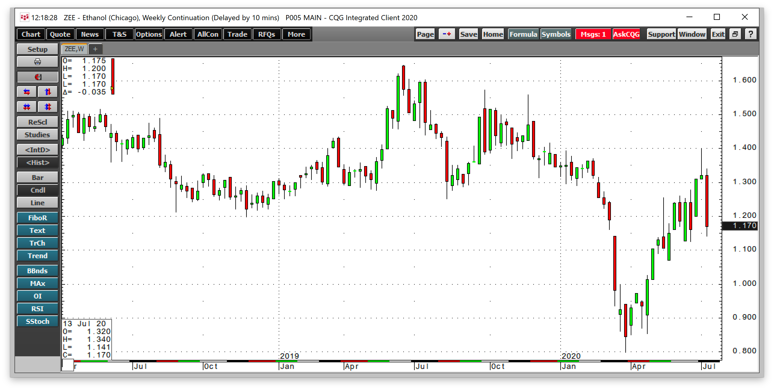 O gráfico semanal mostra que os futuros de etanol subiram de uma mínima recorde de 79,9 centavos de dólar por galão durante a última semana de março para uma alta de US$ 1,40 em 10 de julho. O preço recuou para o nível de US$ 1,17 no final da semana passada, ainda 46,4% superior à mínima recorde.
