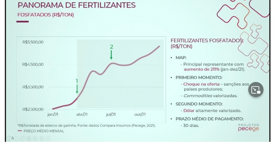 Pesquisa realizada pelo Pecege, aponta que o preço dos fertilizantes fosfatados começou a subir em janeiro de 2021. O principal motivo da alta foi o choque de ofertas, decorrendo das sanções econômicas impostas pelos Estados Unidos ao Marrocos e Rússia, os dois maiores produtores de fertilizantes fosfatados do mundo. Em resposta às sanções, estes países diminuíram ou para alguns países até cortaram a exportação desse produto, reduzindo a oferta e, consequentemente o preço.
