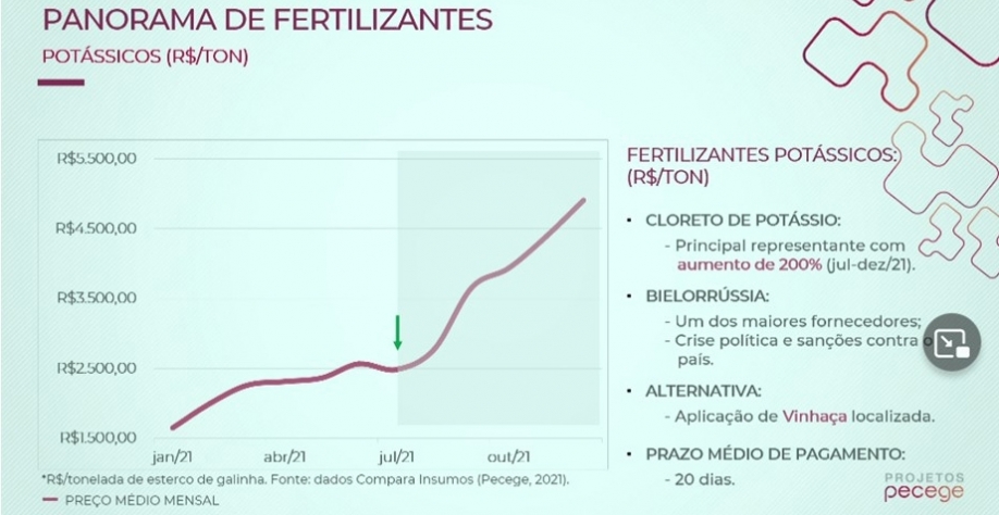 Mas a partir de janeiro de 2021, o preço dos fertilizantes potássicos iniciou uma escala de preços altos. O principal motivo, na época, foram as tensões políticas na Bielorrúsia – maior produtor do mundo desse tipo de fertilizante – que recebeu várias sanções econômicas por parte de países como Estados Unidos. Em represália, a Bielorrúsia restringiu a exportação dos fertilizantes.