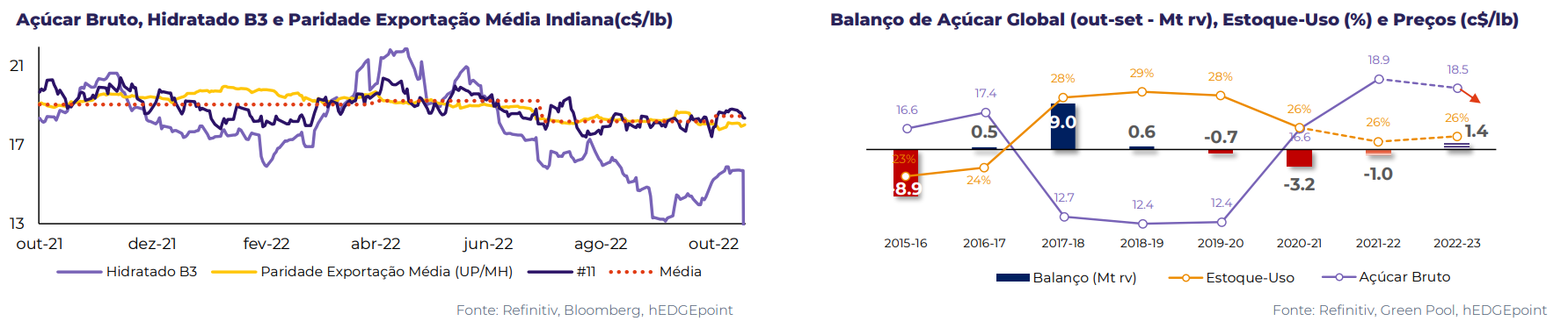 "Quando podemos esperar uma correção? Como há açúcar para sair da Índia e da Tailândia, o atraso no início da safra Indiana pode arrastar o início da correção até novembro. No entanto, observe que podemos ter uma disponibilidade menor da Índia devido aos estoques pressionados", pondera a analista da hEDGEpoint no relatório. Como o país asiático é o principal exportador nesta época do ano -- junto com o Brasil -- para obter fluxos comerciais confortáveis, o mercado internacional terá que pagar sua paridade de exportação.