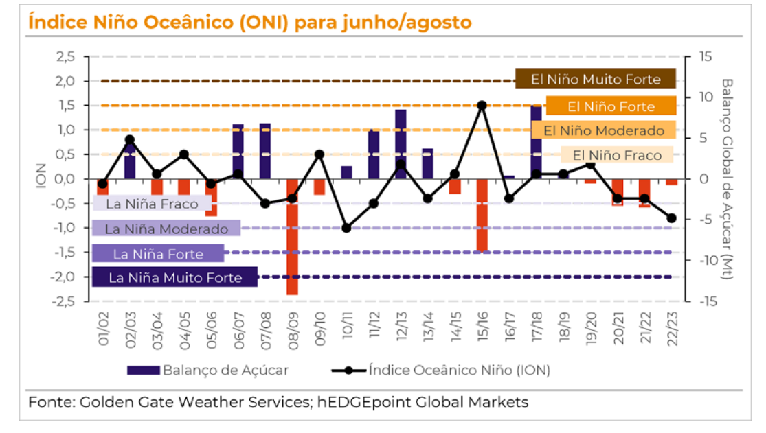 Segundo ela, embora não haja forte correlação entre a ocorrência do padrão El Niño e as quebras da safra de açúcar, sabe-se que ele adiciona volatilidade à sua disponibilidade, especialmente se ocorrer durante a janela junho/agosto, pois pode afetar tanto a safra brasileira quanto o desenvolvimento da cultura no Hemisfério Norte. "No entanto, devemos ter em mente que nem todos os seus efeitos são necessariamente negativos, pois o El Niño afeta de maneira diferente cada região a depender, também, de sua intensidade", ressalta.