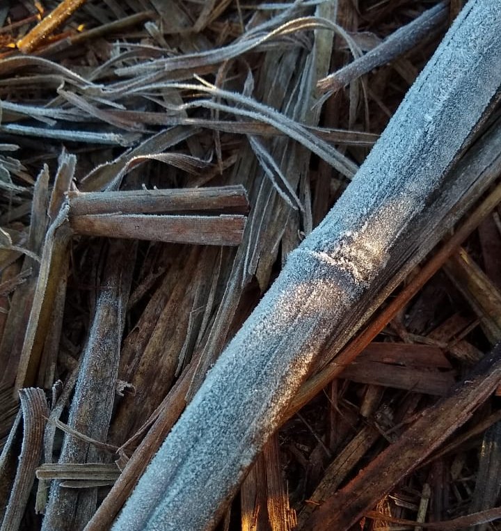 A imagem até que era bonita, mas pode representar perdas. Mas, felizmente, o produtor e sua família analisaram que essa geada não deverá apresentar impactos negativos no canavial, pois a concentração de gelo foi maior nas áreas de baixada e o sol forte eliminou o gelo mais rapidamente.