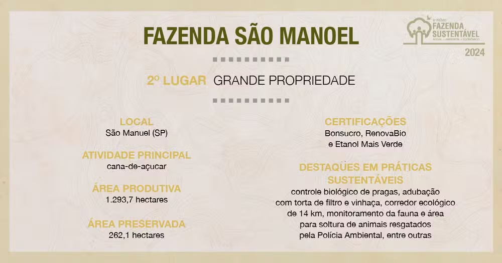 O trabalho desenvolvido na São Manoel foi reconhecido na oitava edição do Prêmio Fazenda Sustentável, uma iniciativa da Globo Rural em parceria com o Rabobank e o Imaflora, e com patrocínio de Cargill e TIM. A fazenda ficou em segundo lugar na categoria Grande Propriedade.