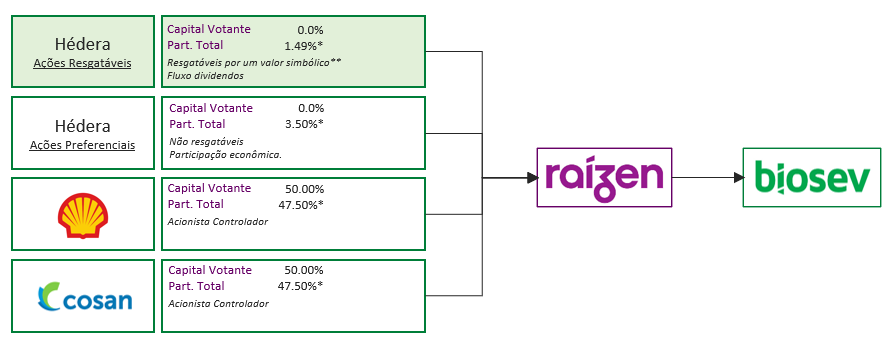 A negociação envolve troca de ações e pagamento em caixa, visto que os ativos da Biosev serão integrados já líquidos de dívida. Uma vez concluída a transação, a Biosev se tornará uma subsidiária da Raízen e seus atuais acionistas migrarão para uma holding que receberá uma participação minoritária na companhia sem direito a voto. Abaixo o organograma da estrutura: