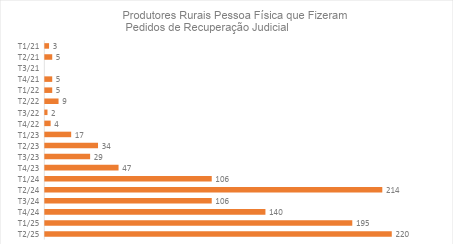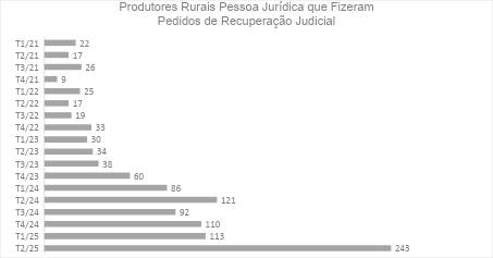 No caso dos produtores pessoa física, também houve aumento no número de pedidos de RJs, com 220 registrados no segundo trimestre de 2025 – contra 214 no mesmo período do ano passado.