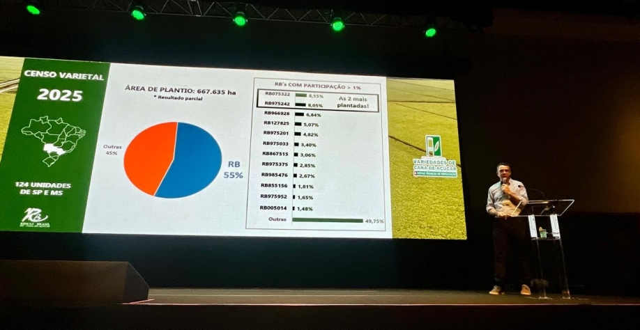 Durante a apresentação, o pesquisador compartilhou casos de campo que reforçam a performance das novas variedades em ambientes restritivos, especialmente solos com baixo teor de argila (menores que 10%). Em um exemplo prático, relatou colheita comparativa em que a RB075322 atingiu 121,4 TCH, contra 94,6 TCH da RB867515 no mesmo talhão, além de entregar 21% a mais de toneladas de açúcar por hectare, mesmo com ATR ligeiramente inferior.
