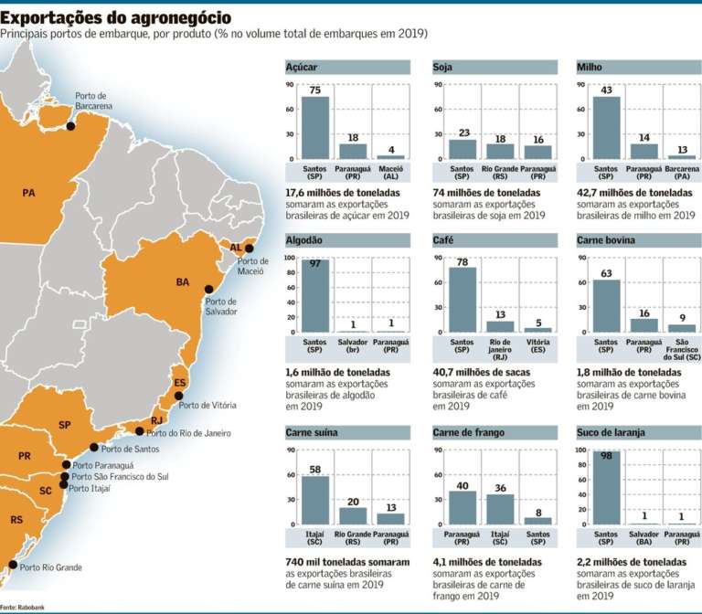 “No caso da soja, vale ressaltar que o Brasil está no período sazonal de maior volume de exportações (2º trimestre). Um fator que, para o grão, mitiga riscos no comparativo com outras commodities agrícolas é que suas exportações são diluídas em mais terminais. Apesar de o porto de Santos ser o principal (23% do total exportado em 2019), se considerado 95% do total exportado no último ano observam-se outros nove terminais que também são usados em grande escala”, diz o estudo.