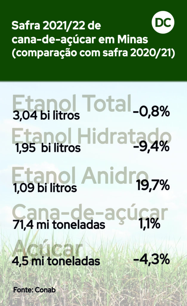 A Companhia Nacional de Abastecimento (Conab) também divulgou, ontem, os dados finais da safra 2020/21 de cana-de-açúcar. No período, Minas Gerais esmagou 70,5 milhões de toneladas de cana, volume que ficou 2,7% maior que as 68,6 milhões de toneladas registradas na safra 2019/20.