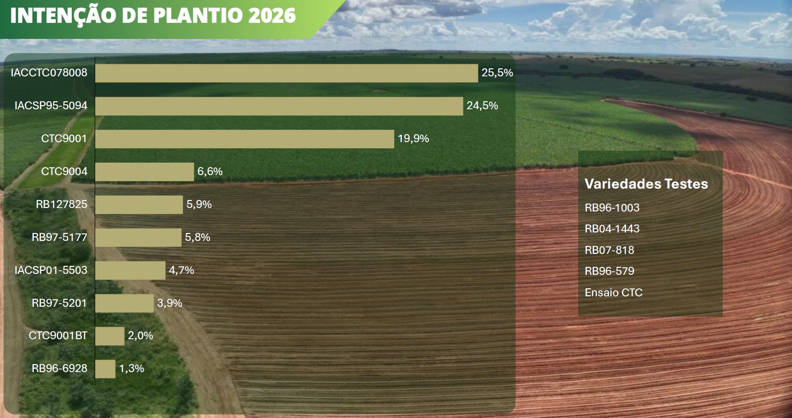 CTC 9001 BT, CTC 9001, IACCTC078008 e IACSP95-5094 se destacaram entre as variedades testadas, com produtividades que chegaram a 200 TCH. Outras, como RB975201, RB985476, RB966928, CTC 9003 e CTC 9004, demonstraram forte potencial para compor futuros plantios.