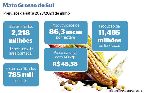 A estimativa é colher 86,3 sacas por hectare, considerando os 785 mil hectares com avarias já identificadas nas lavouras, o Estado deixa de colher 67,5 milhões de sacas de milho neste ano. O estresse hídrico contribuiu para a projeção negativa de que a safra seja 19% menor na comparação ao ciclo 2022/2023.