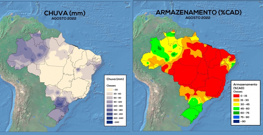 Os menores valores de armazenamento de água no solo foram registrados nas regiões Centro-Oeste, Sudeste e no Matopiba. Os estados mais afetados foram Mato Grosso, Goiás, Mato Grosso do Sul, Minas Gerais, São Paulo, Rio de Janeiro, Espírito Santo, Maranhão, Tocantins, Piauí e Bahia, com armazenamento de água no solo inferior a 15% na maior parte de seus territórios. Baixos valores de armazenamento, inferiores a 30%, também foram registrados no Pará, em Rondônia, no Ceará, no Rio Grande do Norte e na Paraíba. No restante da Região Norte, o armazenamento variou de 30% a 60%, já na Região Sul, de 45% a 60%.