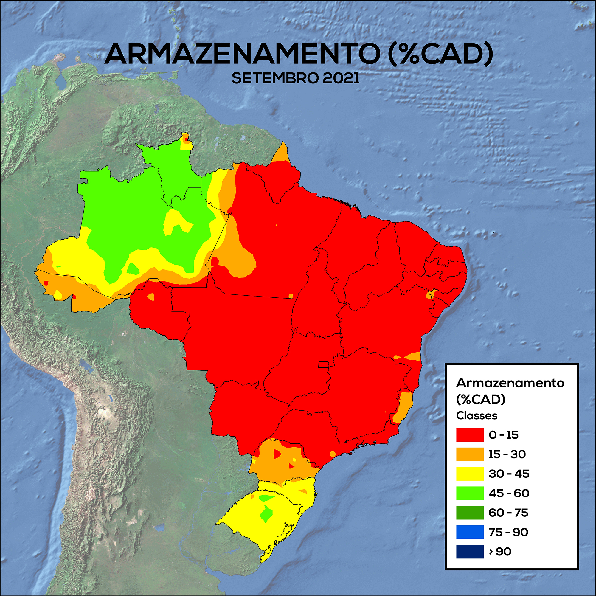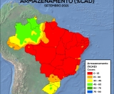 Por conta do menor volume de chuvas, o armazenamento hídrico não superou 15% nas regiões Centro-Oeste, Sudeste e Nordeste, incluindo a maior parte do Pará. As chuvas mais abundantes no Sul não foram suficientes para elevar o armazenamento hídrico para mais de 45% na maior parte da região. O armazenamento variou de 15 a 30% na maior parte do Paraná e de 30 a 45% em Santa Catarina e no Rio Grande do Sul, com exceção das regiões de Passo Fundo, Santa Maria e Santa Cruz do Sul, onde o armazenamento de água no solo chegou até 60%. Na maior parte do Amazonas e de Roraima, o armazenamento ficou entre 45 e 60%. As demais áreas da Região Norte mantiveram baixos valores de armazenamento, de 15 a 45%.