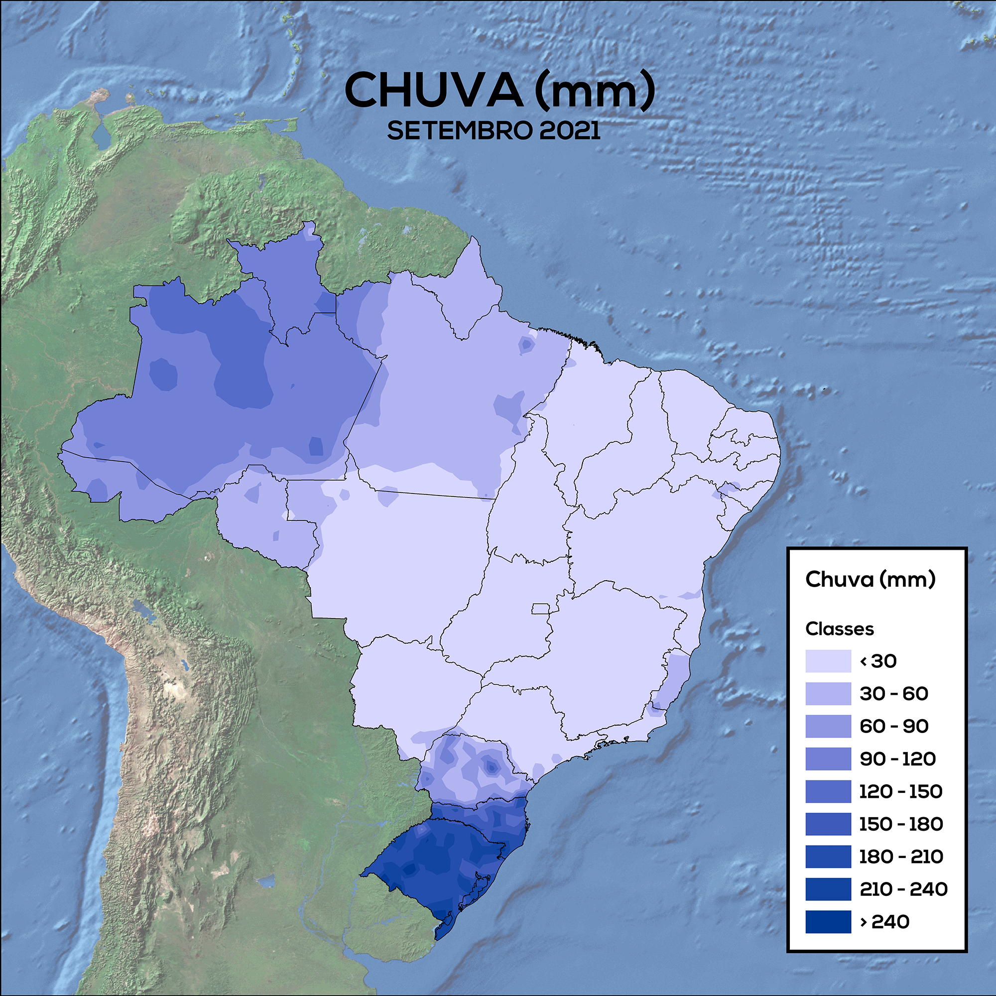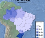 O mês de setembro foi marcado pelos baixos índices pluviométricos na maior parte das regiões agrícolas do país. O total de chuvas nas regiões Centro-Oeste, Sudeste e Nordeste não ultrapassou 30 mm, com exceção do Espírito Santo e de alguns pontos isolados em que o acumulado variou de 30 a 60 mm. Na região Norte, o volume de precipitação acumulado variou, predominantemente, entre 30 e 60 mm nos estados do Pará, Amapá, Rondônia e Acre. Nos estados de Roraima e Amazonas, o total de precipitação ficou, principalmente, entre 60 e 90 mm, chegando até 150 mm no norte amazonense. A Região Sul registrou os maiores acúmulos de precipitação do país, totalizando mais de 150 mm na maior parte dos estados de Santa Catarina e Rio Grande do Sul.