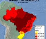 Nas regiões Sudeste e Nordeste, as temperaturas máximas ficaram entre 29 a 33°C, chegando a valores maiores que 33°C em alguns pontos. No Centro-Oeste e no MATOPIBA, observaram-se valores de temperatura máxima, predominantemente, maiores que 33°C. Em Roraima e no Amazonas, as máximas variaram, sobretudo, de 29 a 31°C, e no restante da Região Norte, as máximas ficaram entre 31 e 33°C, ultrapassando 33°C apenas no sul do Pará e no Tocantins. Na Região Sul, as temperaturas máximas foram inferiores a 25°C na maior parte do território, com exceção da maior parte do Paraná, onde prevaleceram máximas de 25 a 29°C.