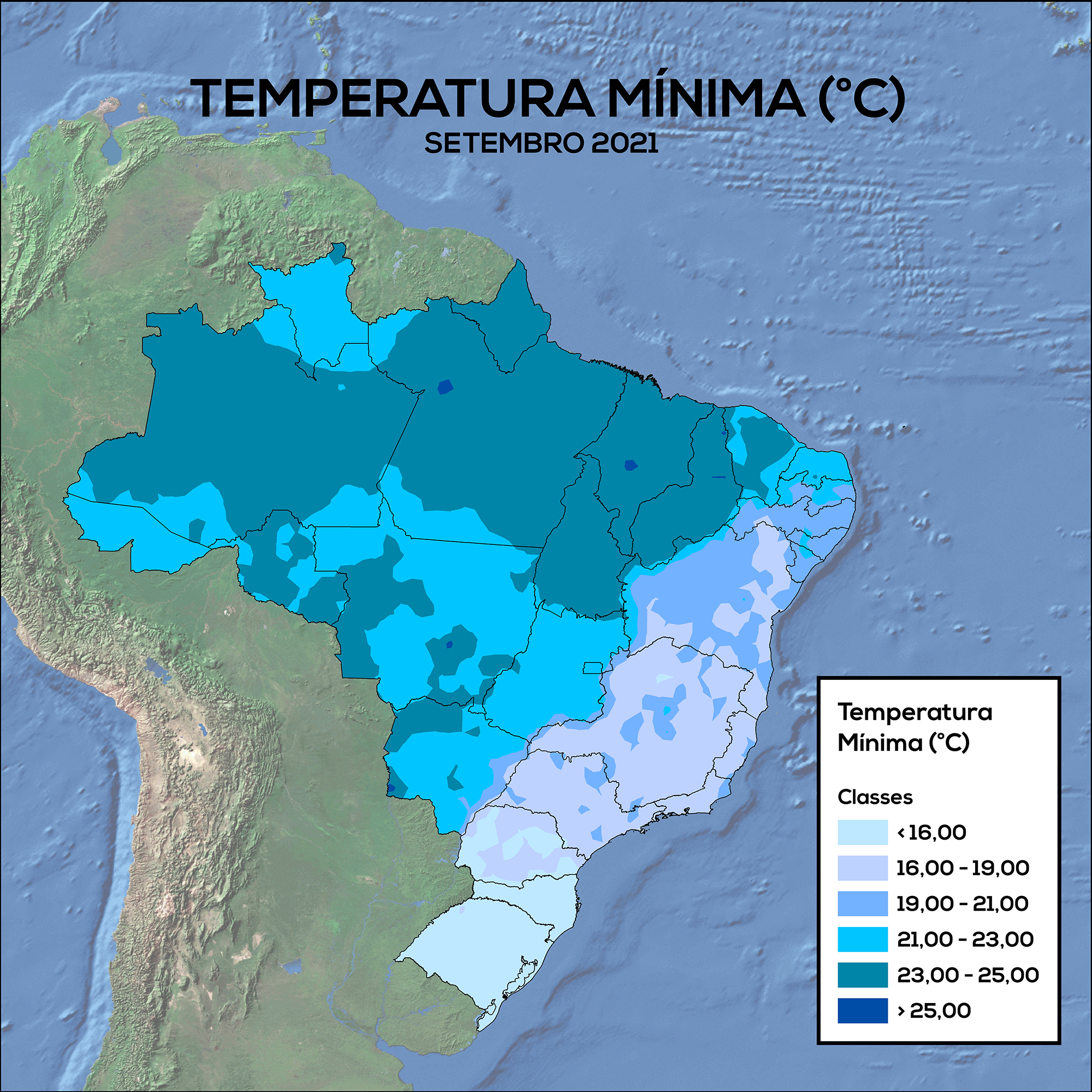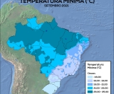 No MATOPIBA e na maior parte da região Norte, foram registrados valores de temperatura mínima entre 23°C e 25°C. No Acre e no Amapá, as mínimas foram de 21 a 23°C. Na Região Centro-Oeste, predominaram temperaturas mínimas entre 21 e 23°C, com áreas esparsas onde as mínimas variaram de 23 a 25°C. No Sudeste, predominaram mínimas de 16 a 19°C, com pontos isolados variando de 19 a 21°C. No Meio-norte nordestino as mínimas ficaram entre 23 e 25°C, nas demais áreas da Região Nordeste as temperaturas mínimas ficaram entre 16 e 21°C. A Região Sul apresentou os menores valores de temperatura mínima, com valores, em sua maioria, abaixo de 16°C.