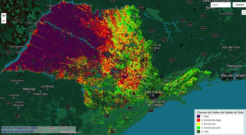 Mapa de saúde dos solos do Estado de SP. Fonte: Poppiel et. al (2025) – GeoCIS