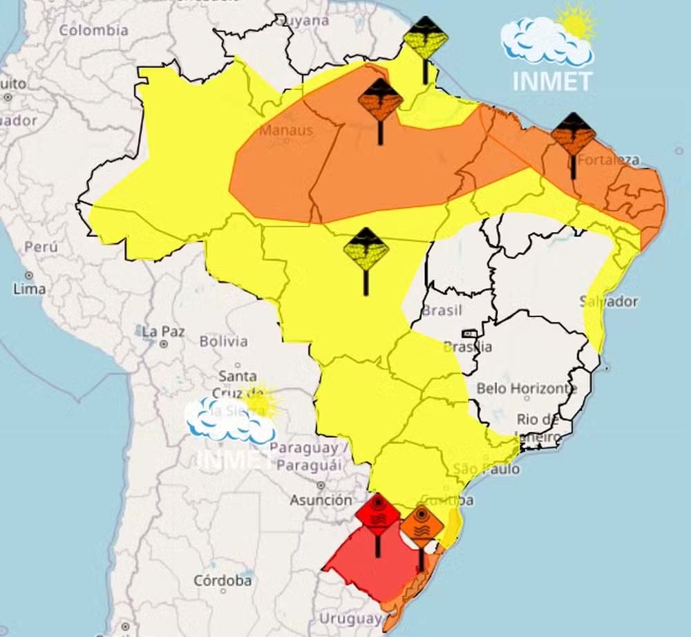 Também foi emitido um aviso amarelo de perigo potencial para chuvas intensas entre o Norte e o Sul do país, até Santa Catarina, que prevê chuva entre 20 e 30 milímetros por hora.