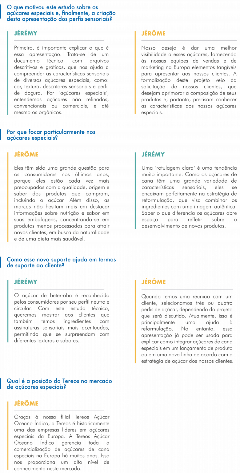 Diante de tais mudanças nos padrões de consumo, as equipes da Tereos decidiram oferecer um suporte mais concreto aos seus clientes, a fim de torná-los mais conscientes das ofertas do Grupo. Elas desenvolveram um estudo apresentando o perfil sensorial de diversos açúcares especiais. Jérémy Colas (P&D e aplicações – Gerente da categoria de bebidas) e Jérôme De Peyrolle (Marketing – Gerente de produto) explicaram as questões que envolvem nossos açúcares especiais.