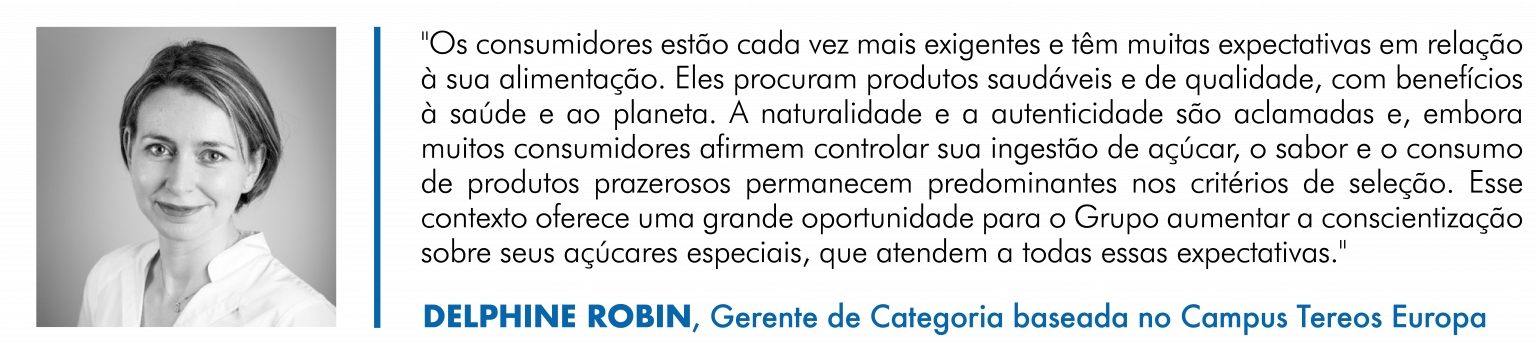 Entre os colaboradores que participaram do desenvolvimento desta apresentação sobre açúcares especiais, Delphine Robin, Gerente de Categoria baseada no Campus Tereos Europa, explica como esse estudo sensorial está em sintonia com a atualidade e sua importância estratégica para o Grupo:
