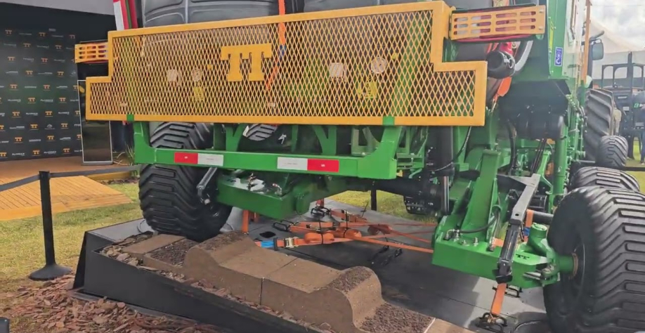 Segundo Márcia Sanches, gerente comercial da TT do Brasil, a plantadora com alto nivelamento mantém a máquina “na linha do horizonte” para garantir distribuição uniforme de mudas nos dois sulcos e reduzir o risco de escorregamento em operação. O novo recurso apresentado na feira é um eixo direcional instalado na traseira, que amplia a atuação do conjunto para áreas com inclinação acima de 9 graus, ajudando a autocorreção do implemento e evitando que a plantadora “entre no sulco” em trechos de maior declividade.