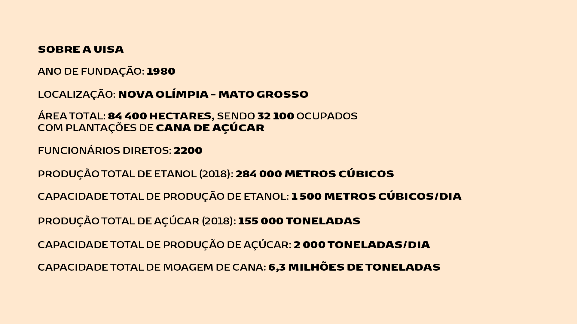 A Uisa, antiga Usinas Itamarati, uma das maiores produtoras de etanol e açúcar do Brasil, encerrou a safra 2019/20 com o recorde de moagem dos últimos seis anos: 5,025 milhões de toneladas de cana. Com essa moagem, a Uisa, localizada em Nova Olímpia, no Mato Grosso, atingiu também uma produção total de 172 000 toneladas de açúcar e de 286 000 m3 de etanol, enquanto que na safra de 2018/19, produziu 284 000 m3 de etanol e 155 000 toneladas de açúcar cristal.